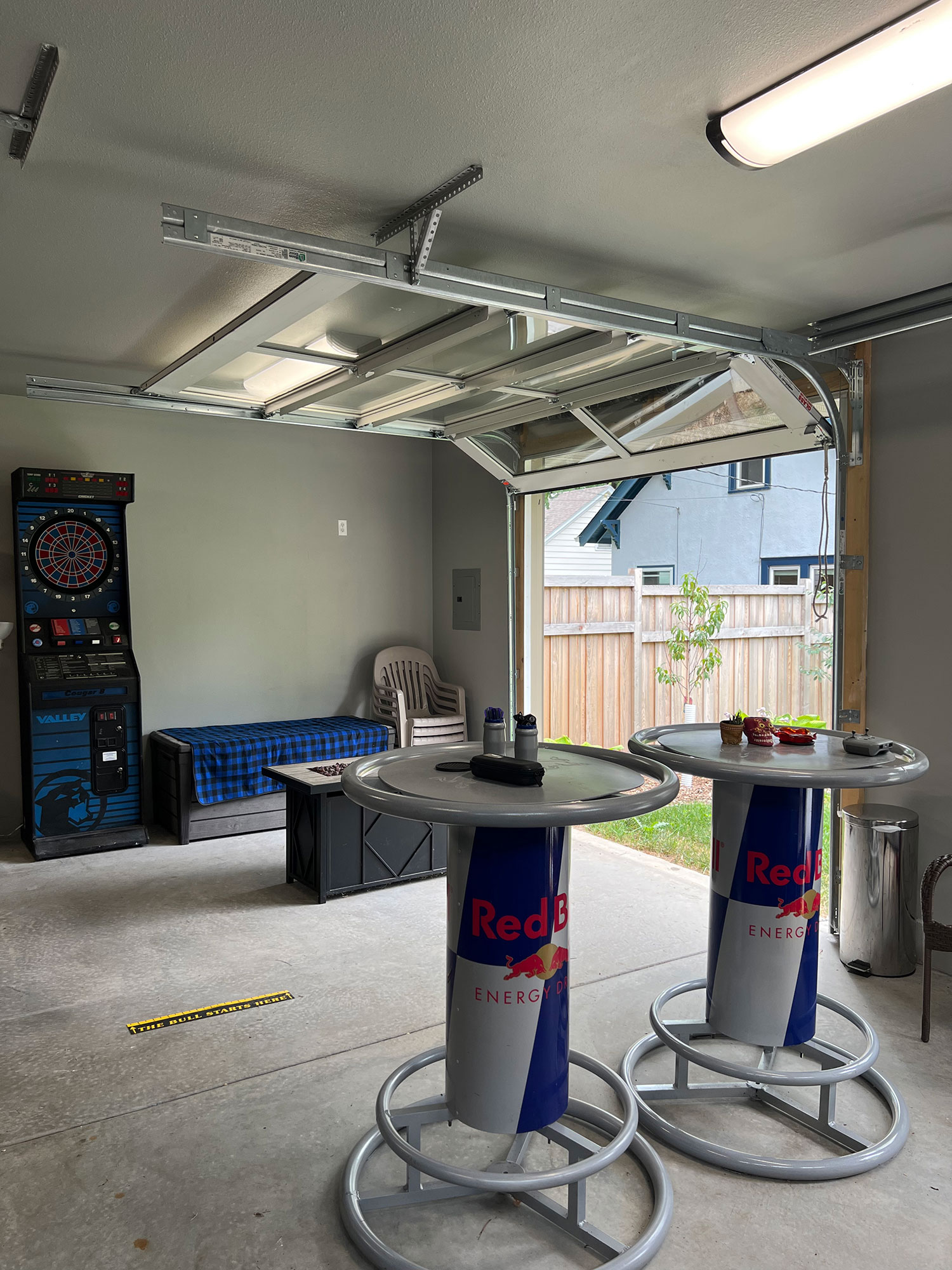 The garage includes stunning 8’ glass overhead doors that look out to the yard. This door helps connect the yard to the entertainment space within the garage.